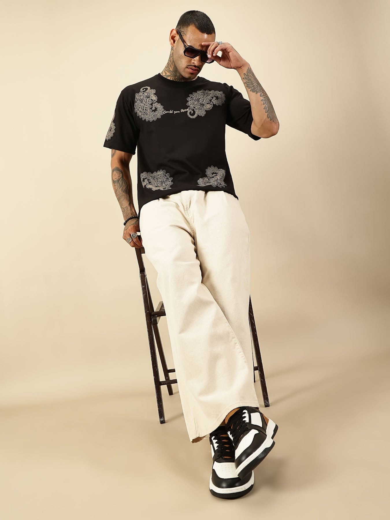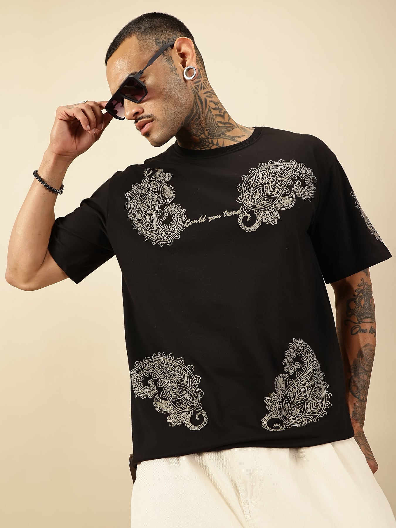 Noir Bandana Master the art of understated sophistication with this men's black paisley print oversized t-shirt. The intricate bandana-inspired pattern delivers visual depth while the relaxed oversized silhouette ensures effortless comfort and contemporary style. Crafted for versatility, it pairs seamlessly with tailored trousers for elevated casual wear or with denim for laid-back authenticity. The premium black base provides a refined canvas that transcends seasonal trends, making it an essential addition to any discerning wardrobe. Perfect for those who understand that true style lies in the details.